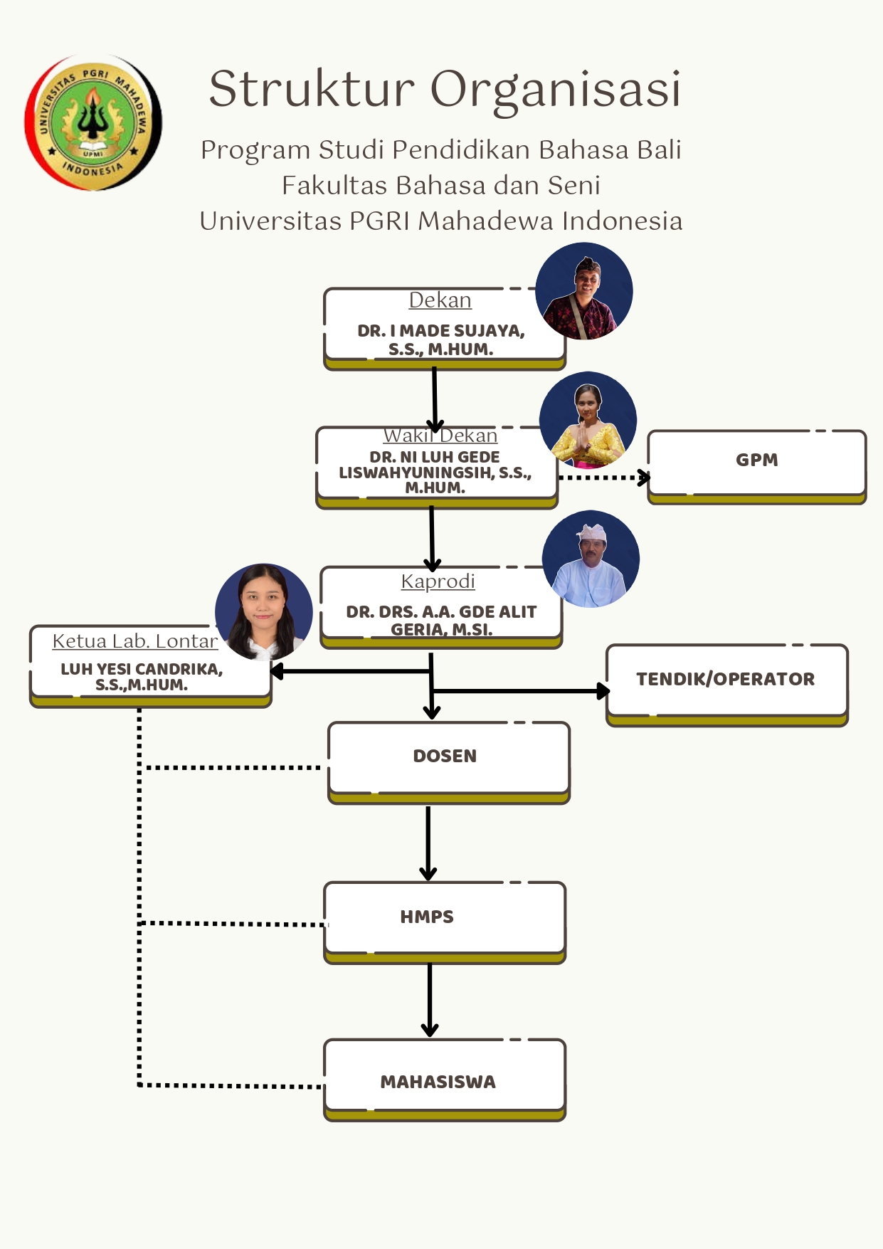 Untuk menjalankan operasional prodi, Rektor Universitas PGRI Mahadewa Indonesia menunjuk I Nyoman Sadwika, S.Pd., M.Hum. sebagai Ketua Program Studi Pendidikan Bahasa Bali sejak 19 Desember 2023 hingga 1 Oktober 2024. Sejak 2 Oktober 2024 hingga sekarang, Ketua Prodi Pendidikan Bahasa Bali dipercayakan kepada Dr. Drs. Anak Agung Gde Alit Geria, M.Si.